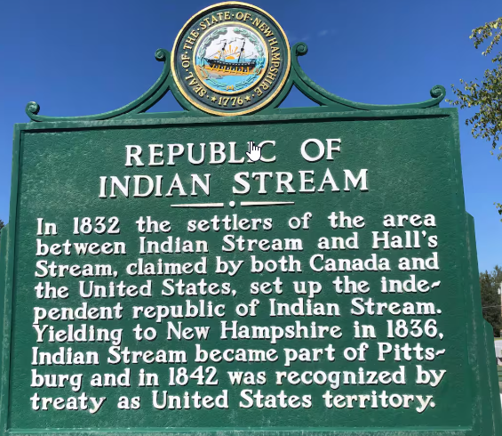 L’histoire de la Republic of Indian Stream Territory, communément appelée l’Indian Stream, commence avec la signature du traité de Paris en 1783. La description de la frontière entre le Bas-Canada et le New Hampshire, plutôt floue sur un territoire méconnu, laisse sans juridiction. La République d’Indian Stream était située sur une bande de terre d’environ 730 kilomètres carrés au nord-est de l’actuel État américain du New Hampshire, près du Vermont et de la frontière avec l’actuelle province canadienne du Québec. La naissance de ce petit pays a été motivée par la confusion causée par les interprétations différentes que Londres et Washington ont données à l’accord qui a mis fin à la guerre d’indépendance des États-Unis : le traité de Paris de 1783. Ce pacte a non seulement permis au Royaume-Uni de reconnaître l’émancipation de ses 13 anciennes colonies d’Amérique du Nord, mais il a également délimité la frontière internationale avec le Canada, qui est resté sous contrôle britannique.
