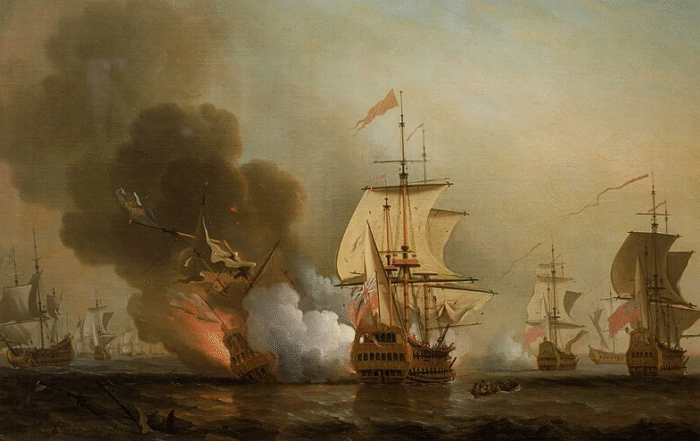 Combat naval au large de Carthagène, 28 mai 1708. Une escadre britannique attaque la flotte de l’or espagnole. Un navire espagnol est capturé, un autre contraint de s’échouer, et le San Jose qui transportait l’essentiel du trésor espagnol, est détruit par l’explosion de sa poudrière. Samuel Scott (1702-1772).