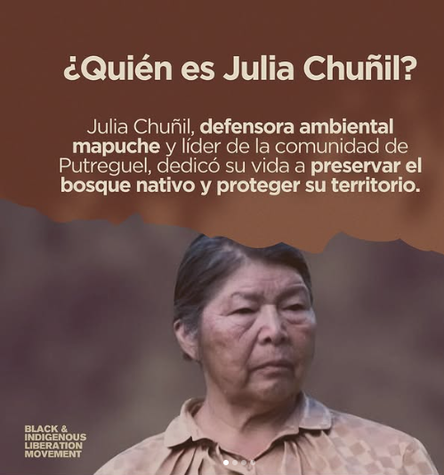 Julia Chuñil Cutricura, 72 ans, activiste environnementale, présidente de la communauté mapuche de Putreguel, région des Los Ríos, dans le sud du Chili, a disparu sans laisser des traces.