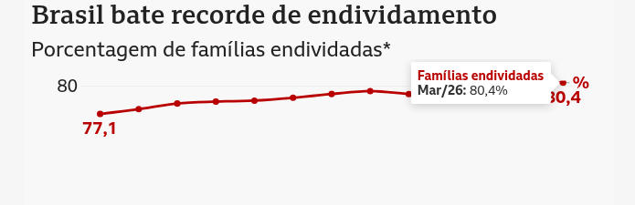 La détresse de cette mère (rapportée dans la presse locale) est aujourd’hui celle de 80,4 % des familles brésiliennes, qui étaient endettées en mars, un record dans la série historique de l’Enquête sur l’endettement et le défaut de paiement des consommateurs (Peic), menée depuis janvier 2010 par la Confédération nationale du commerce des biens, des services et du tourisme (CNC).